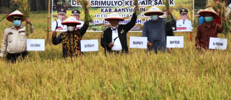 BANYUASIN, KABARKATA.COM__ Bupati Banyuasin, H Askolani SH MH bersama Anggota DPRD Banyuasin Fraksi PDI-P Arisa Lahari melaksanakan Panen Raya Padi IP 200 di Desa Sri Mulyo Kecamatan Air Salek Kabupaten Banyuasin.