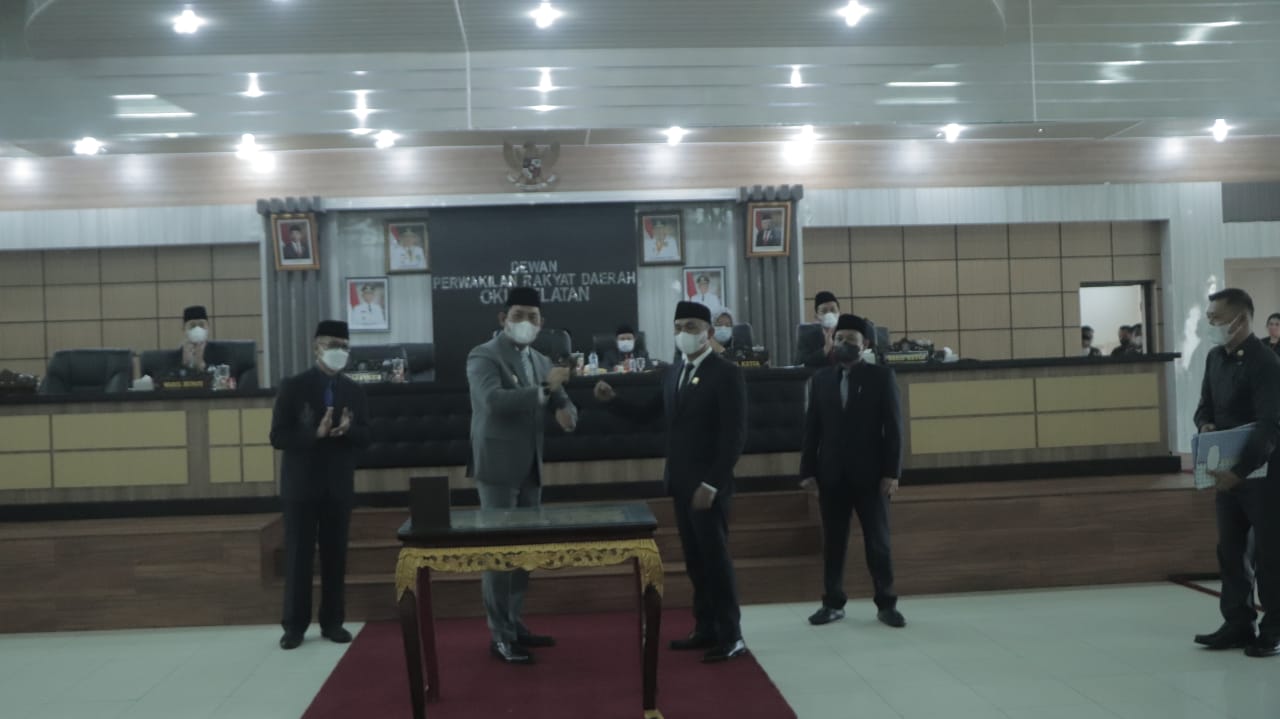 Bupati OKU Selatan Popo Ali M.,B.Com., bersama Ketua DPRD OKU Selatan Heri Martadinata, S.E. tandatangani Nota Kesepakatan Keputusan DPRD, Berita Acara, dan Keputusan Bersama pada Rapat Paripurna DPRD Kabupaten OKU Selatan dalam rangka dalam rangka Pembahasan Rancangan Perubahan Kebijakan Umum Anggaran dan Rancangan Perubahan Prioritas Plafon Anggaran Sementara Anggaran Pendapat dan Belanja Daerah Kabupaten OKU Selatan Tahun Anggaran 2021.