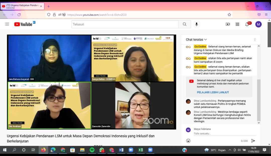 Pada Selasa 17 Mei 2022, Kelompok Kerja (Pokja) Pendanaan LSM kembali melakukan Dialog Publik secara daring untuk mendorong kebijakan baru Dana Abadi LSM bagi penguatan LSM dan pemberdayaan warga. Pokja Pendanaan LSM terdiri dari INFID, KAPAL Perempuan, Konsil LSM, Transparansi Internasional Indonesia, Perkumpulan Prakarsa, Indonesia untuk Kemanusiaan, Yayasan Penabulu dan REMDEC Swaprakarsa.
