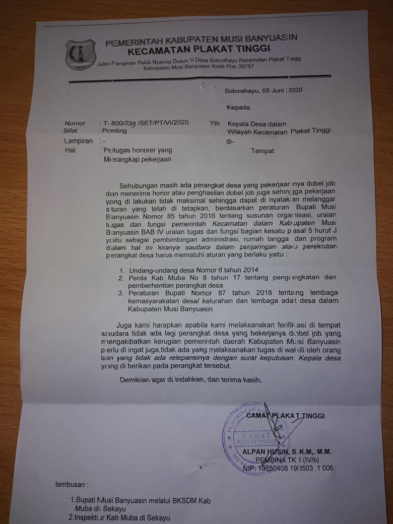 Menurut keterangan A warga Desa Suka maju Kecamatan Plakat Tinggi bahwa J sudah cukup lama merangakap jabatan, sedangkan baru – baru ini Camat Plakat Tinggi sudah memberi surat edaran Nomor:T.800/ 229/SET/ PT./2020.tentang petugas honorer yang merangkap jabatan.