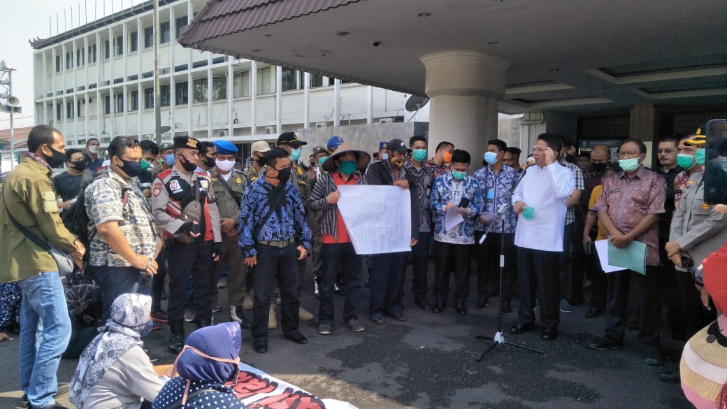 Palembang,kabarkata.com – Puluhan warga kawasan Labi-labi Kecamatan Alang Alang Lebar (AAL) Palembang, yang menamakan diri Persatuan Masyarakat Pejuang Tanah menggelar aksi demo di halaman Kantor Gubernur Sumatera Selatan (Sumsel), Jumat (10/7/2020). Pendemo yand didominasi kaum perempuan ini menyampaikan aspirasinya secara langsung kepada Gubernur Sumsel Herman Deru, terkait sengketa lahan seluas 32 hektar (ha) antara 521 Kepala Keluarga (KK) warga dengan pihak PT Timur Jaya Grup yang mengklaim kepemilikan atas lahan tersebut sejak 2019 lalu.