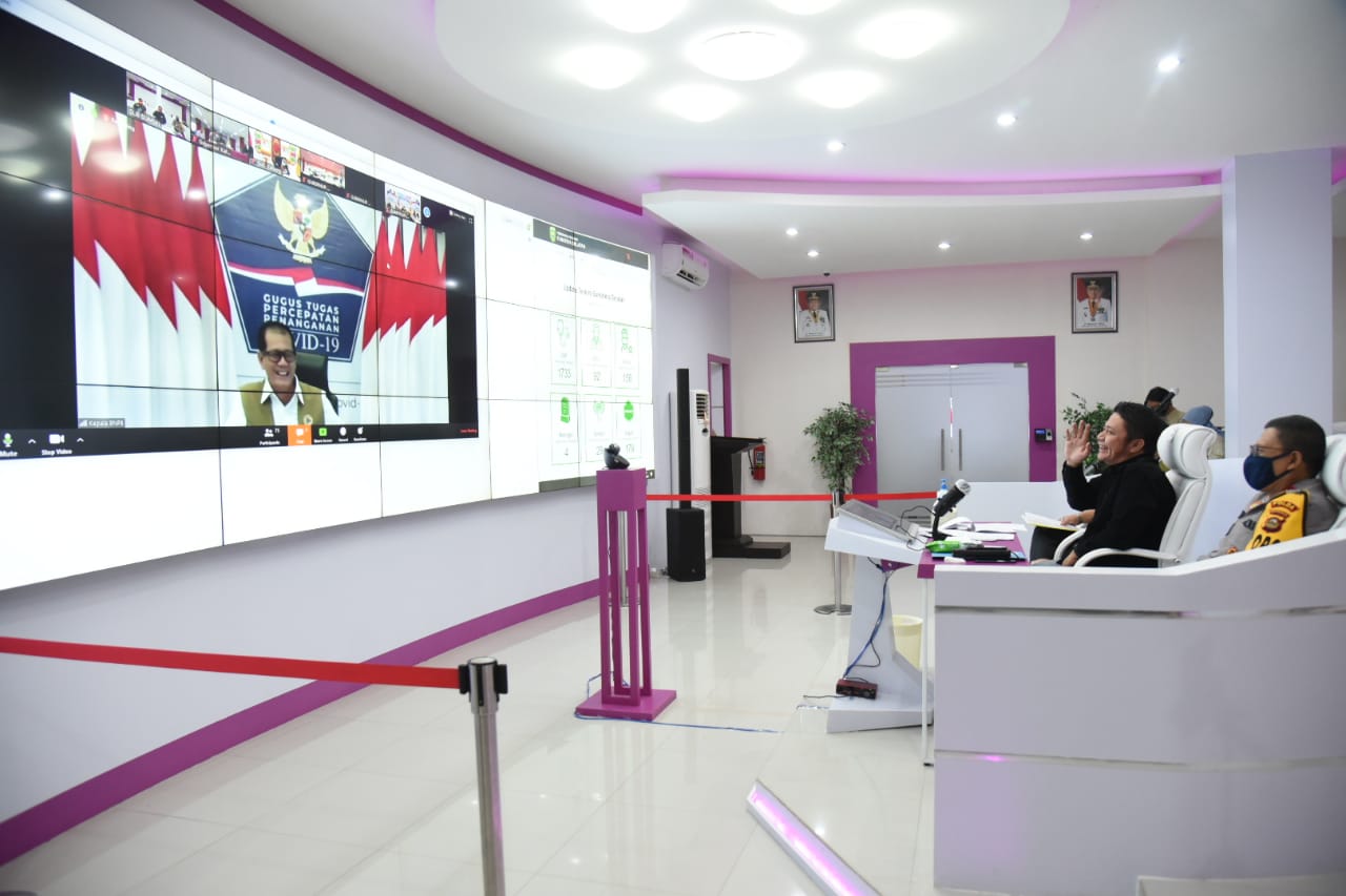 Palembang,kabarkata.com-  Gubernur Sumsel H.Herman Deru didampingi Kapolda Sumsel Irjen Pol Drs Priyo Widyanto dan Sekda Sumsel H. Nasrun Umar mengikuti Rapat Koordinasi Operasi Percepatan Penanganan Covid-19 bersama Kepala Gugus Tugas Percepatan Penanganan Covid 19 melalui video conference dari Command Centre Kantor Gubernur Sumsel, Sabtu (2/5) pagi.