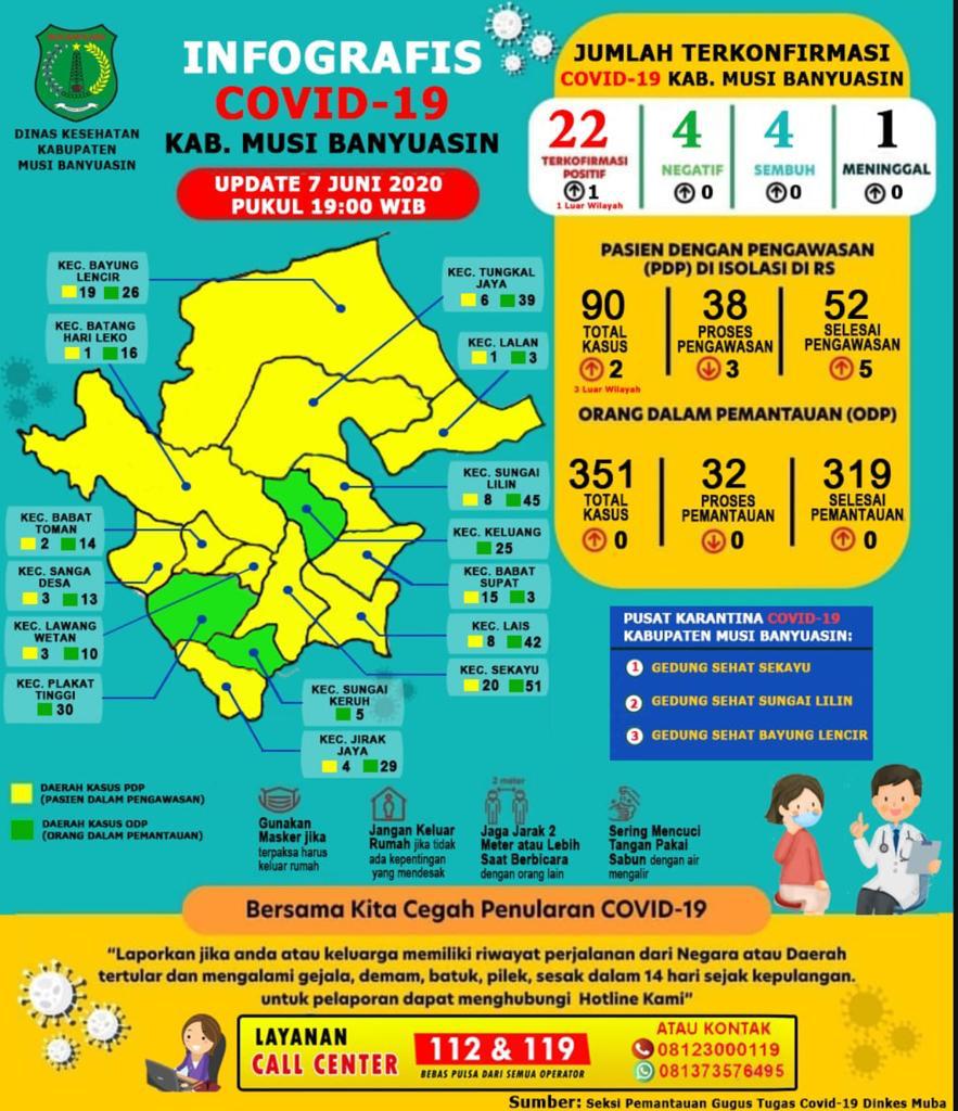 Penambahan positif Covid-19 tersebut yakni kasus 22 jenis kelamin laki-laki usia 69 tahun Desa Sukamaju Kecamatan Babat Supat (Lokal). Dengan penambahan 1 kasus ini, total positif covid-19 di Muba menjadi 22 kasus 4 kasus diantaranya telah sembuh dan 1 meninggal dunia.