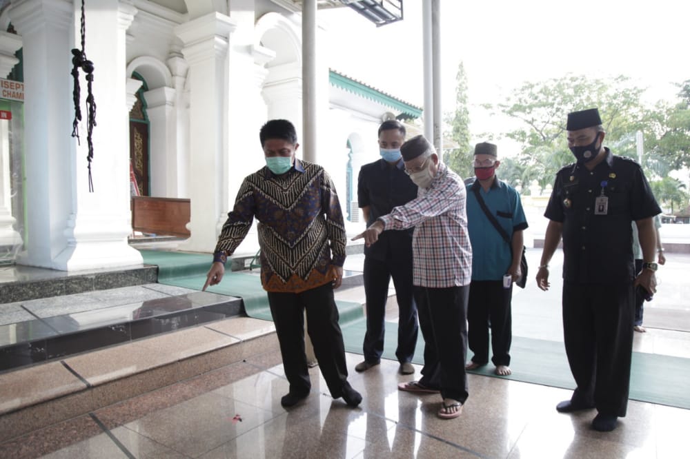 Palembang,kabarkata.com – Sehari menjelang hari raya Idul Adha 1441 Hijriyah yang jatuh pada hari Jumat, 31 Juli 2020, pada Kamis (30/07) sore Gubernur Sumsel Herman Deru menyempatkan diri untuk meninjau tertib pelaksanaan sholat Idul Adha di Masjid Agung Sultan Mahmud Badaruddin I Jayo Wikramo atau biasa disebut Masjid Agung Palembang. Kedatangan HD diterima Ketua Umum Yayasan Masjid Agung Palembang, Syarnubi. Di sini HD meninjau bagaimana pengaturan tata letak bagi jemaah yang akan shalat, juga penyediaan air tempat mencuci tangan untuk jemaah.