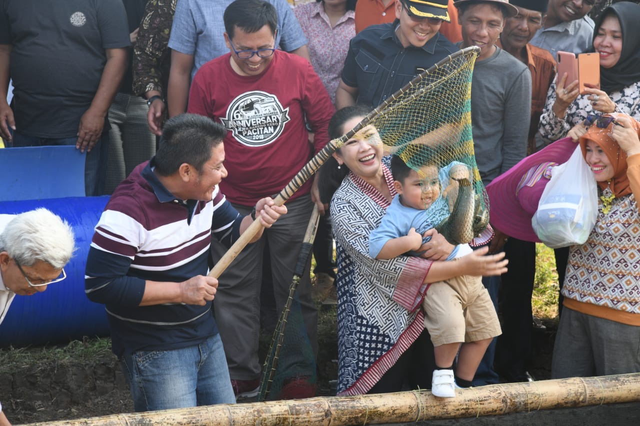 eru didampingi Ketua TP PKK Provinsi Sumsel Hj. Febrita Lustia langsung menuju tambak ikan dalam rangka panen ikan bersama-sama (melebung).