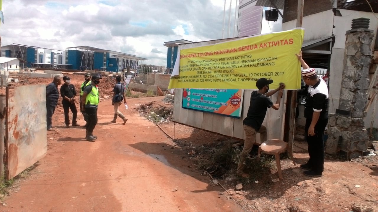 PALEMBANG,kabarkata.com – Herman Iskandar (79) melalui tim kuasa hukumnya Hari ini (Rabu 08/07/2020) melakukan pemagaran dan pelarangan memasuki dan melakukan aktivitas di atas tanah miliknya saat ini sedang berlansung pembangunan Gedung Universitas Islam Negri (UIN) Raden Fattah yang dikerjakan PT Nindya Karya, pelarangan tersebut karena Gubernur Sumatera Selatan (Sumsel) dan Rektor UIN Raden Fatah Palembang tidak melaksanakan kewajibannya membayar ganti rugi atas tanah seluas 12.365 m2 setelah dinyatakan kalah oleh Majelis Hakim Mahkamah Agung RI berdasarkan putusan Mahkamah Agung RI No. 2334 K/PDT/2017 tanggal 19 Oktober 2017 jo Putusan PK N0. 726 PK/PDT/2018 tanggal 7 Nopember 2018. Pada putusan MA RI yang sudah berkekuatan hukum tetap tersebut, Gubernur Sumsel dan Rekor UIN Raden Fatah Palembang secara tanggung renteng harus membayar ganti rugi kepada Herman Iskandar sebesar Rp. 18.952.000.000.- (delapan belas milyar sembilan ratus lima puluh dua juta rupiah).