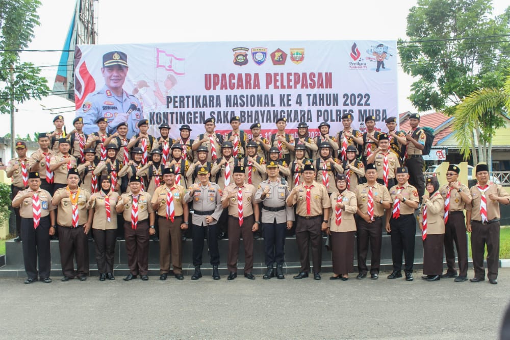 Pj Sekda Muba H Musni Wijaya S Sos MSi selaku Ketua Kwartir cabang Gerakan Pramuka pada kesempatan tersebut ucapkan selamat berjuang kepada peserta kontingen Saka Bhayangkara Polres Muba.
