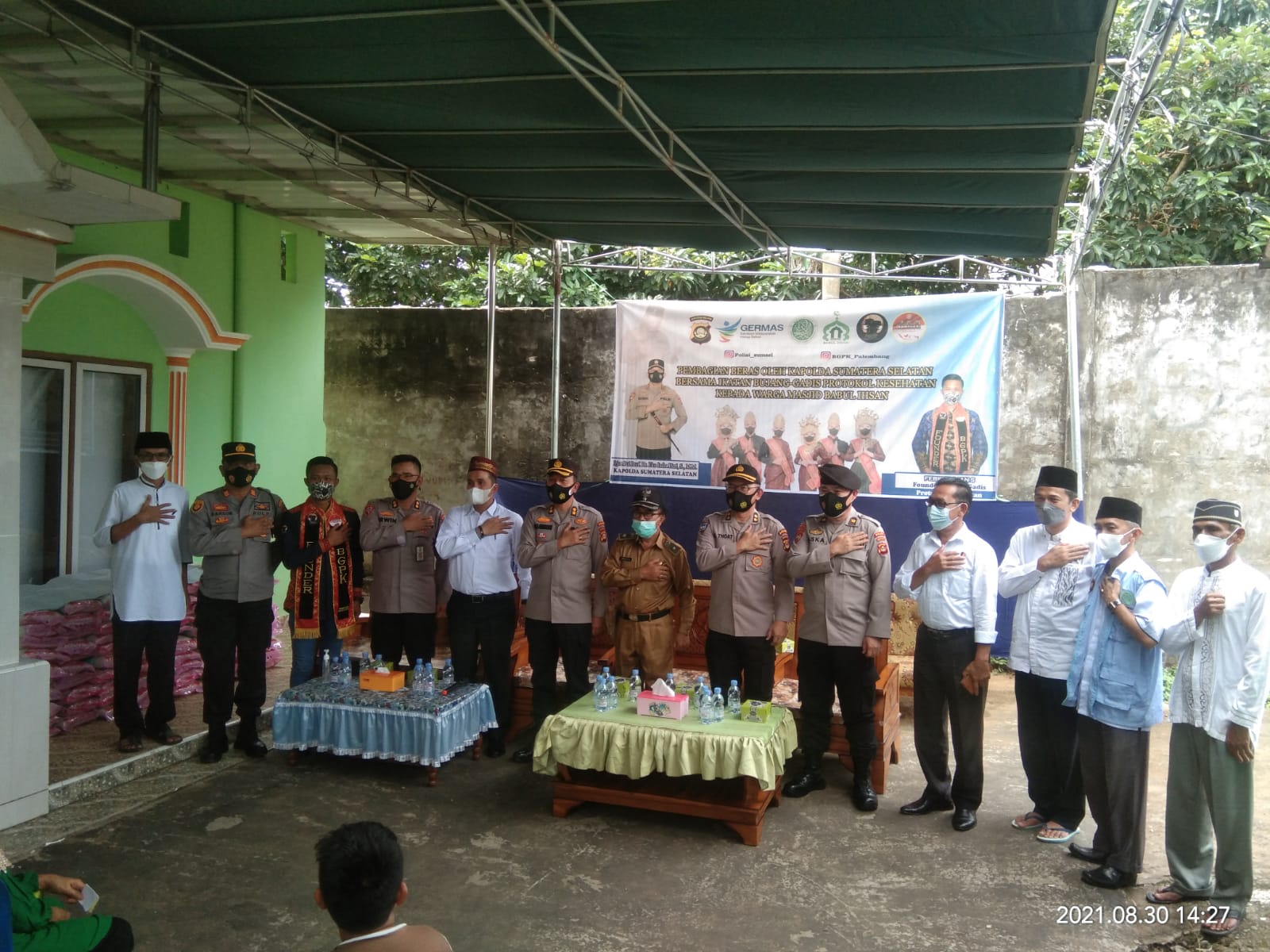 KABARKATA.COM- Senin 30 Agustus 2021 Kapolda Sumatera Selatan Bersama Ikatan Bujang Gadis Protokol Kesehatan Kepada Warga Babul Ihsan yang terdampak bencana kesehatan covid 19.