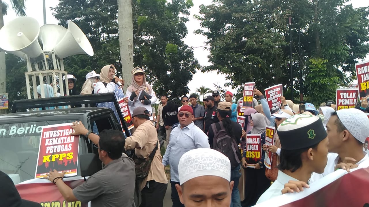 Palembang, kabarkata.com – Ratusan emak emak yang tergabung dalam Kobarkan Perang meneteskan air mata melakukan aksi demo di Kantor Bawaslu Sumsel, Kamis (16/5/2019). Aksi demo tersebut sebagai bentuk kekesalan dan kecurangan Pemilu 2019 yang telah dilakukan oknum.