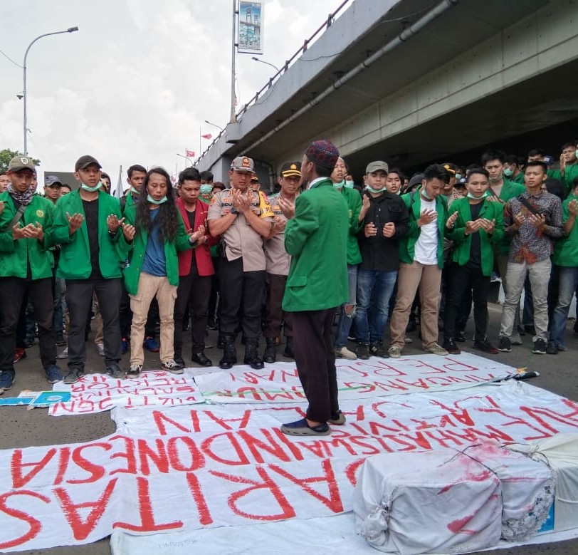Usai orasi, massa aksi bersama Kapolresta Palembang Kombes Pol Didi Hayamansyah dan Kabid Humas Polda Sumsel Kombes Pol Supriadi bersama massa aksi shalat ghaib baik mahasiswa yang meninggal dunia.