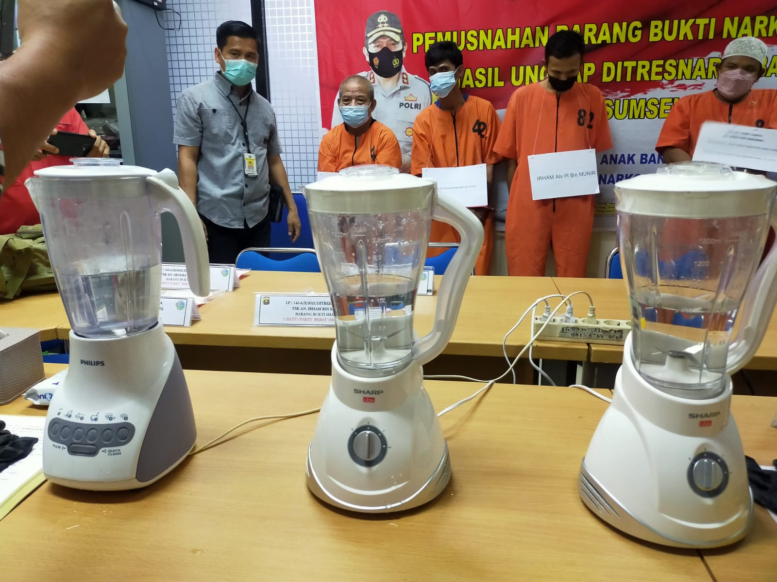 barang bukti sabu – sabu seberat 492,9 gram dimusnahkan dengan cara diblender dan dilaksanakan di gedung Ditresnarkoba Polda Sumsel.