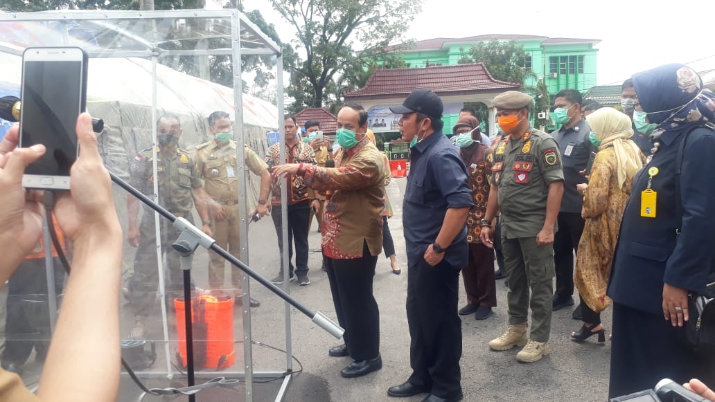 Rektor Unsri, Prof. Dr. Ir. H. Anis Saggaff yang memberikan langsung alat bilik ruang desinfeksi tersebut kepada Gubernur Sumsel, H. Herman Deru yang disaksikan langsung oleh Asisten I, Asisten III, Kepala Dinas Kesehatan Provinsi, Kasat Pol PP dan Kepala pelaksana harian BPBD Sumsel serta beberapa Kepala OPD dilingkungan Pemerintah Provinsi Sumatera Selatan.