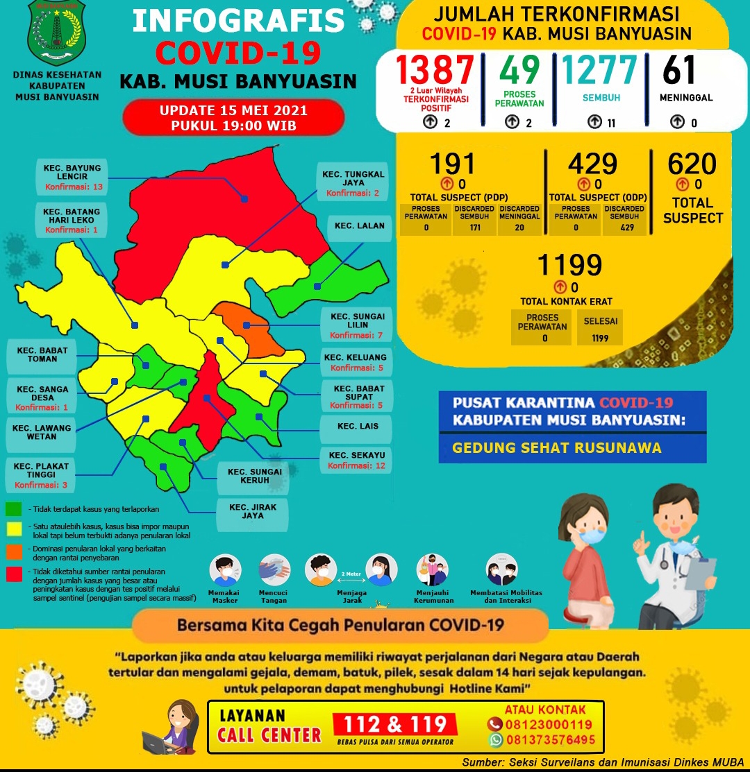 Sementara itu, berdasarkan data update Gugus Tugas Penanganan COVID-19 Muba 15 Mei 2021 tercatat ada sebanyak 429 ODP 429 selesai pemantauan 0 masih dipantau, 1.199 kontak erat 1.199 kontak selesai pemantauan 0 kontak erat yang masih dipantau, 191 PDP 1 proses pengawasan 190 selesai pengawasan.