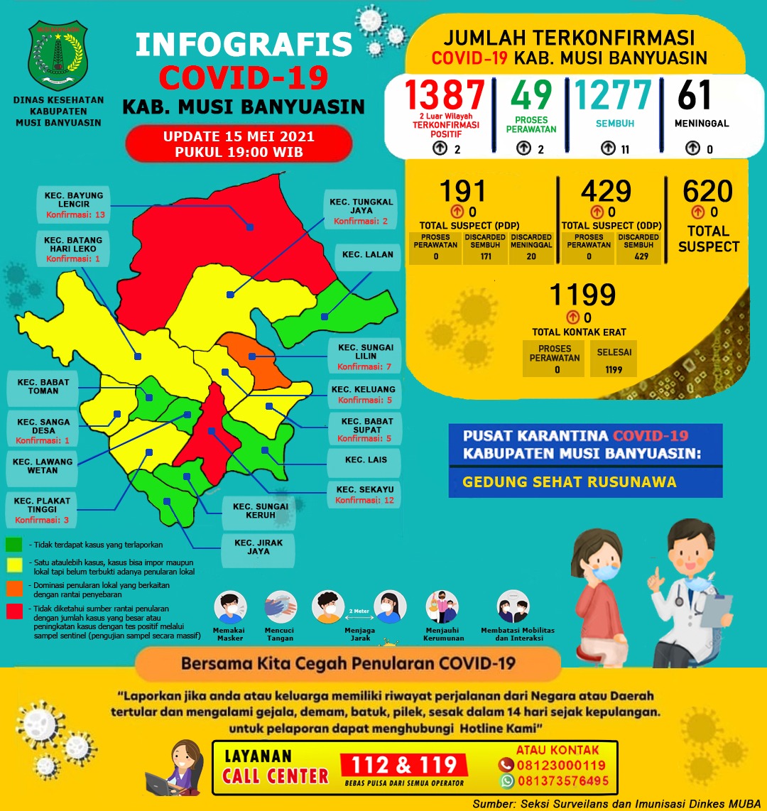 Sementara itu, berdasarkan data update Gugus Tugas Penanganan COVID-19 Muba 15 Mei 2021 tercatat ada sebanyak 429 ODP 429 selesai pemantauan 0 masih dipantau, 1.199 kontak erat 1.199 kontak selesai pemantauan 0 kontak erat yang masih dipantau, 191 PDP 1 proses pengawasan 190 selesai pengawasan.