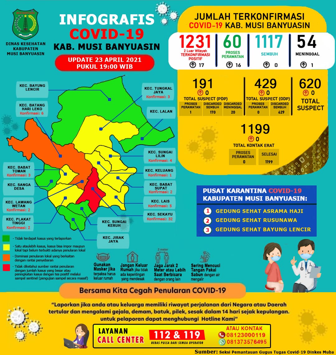 “Ada penambahan 17 kasus positif dan 1 meninggal dunia per 23 April 2021,” ungkap Jubir Gugus Tugas Penanganan COVID-19 Muba, dr Povi Pada Indarta SP P.