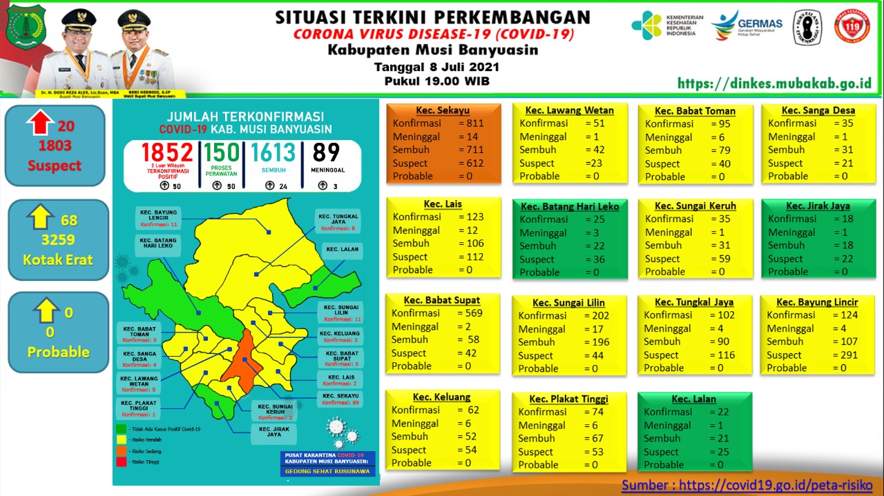 Povi merinci, adapun penambahan kasus positif diantaranya kasus 1803 Laki-laki 32 tahun Sekayu, kasus 1804 Laki-laki 56 tahun Sekayu, kasus 1805 Laki-laki 24 tahun Sekayu, kasus 1806 perempuan 26 tahun Rantau Panjang, kasus 1807 Laki-laki 26 tahun Plakat Tinggi, kasus 1808 perempuan 7 tahun Balai Agung, kasus 1809 perempuan 37 tahun Sekayu, kasus 1810 perempuan 26 tahun Sekayu, kasus 1811 Laki-laki 45 tahun Sekayu, kasus 1812 Laki-laki 44 tahun Balai Agung, kasus 1813 perempuan 36 tahun Babat Toman.