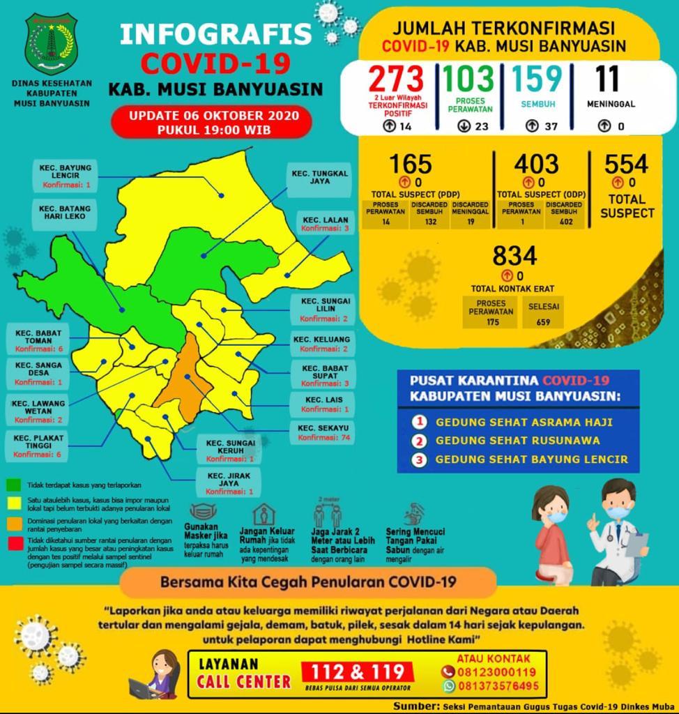 Lingga mencatat hingga 6 Oktober 2020 ada sebanyak 273 kasus terkonfirmasi di Muba. “159 kasus sembuh, 11 meninggal dunia, dan 103 orang masih dirawat,” terangnya.