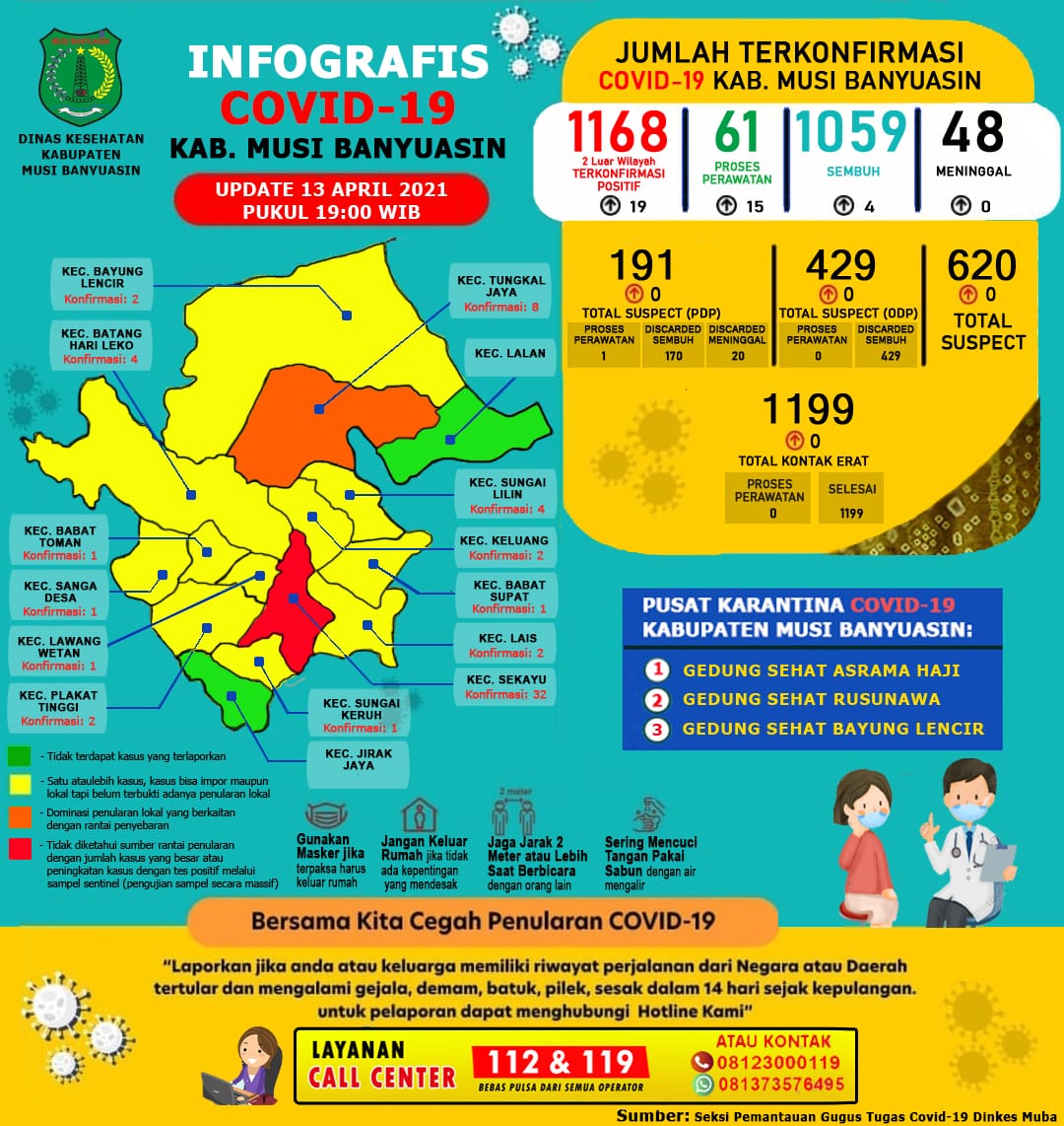 “Ada penambahan 4 kasus sembuh dan 19 positif COVID-19 per 13 April 2021,” ungkap Jubir Gugus Tugas Penanganan COVID-19 Muba, Seftiani Peratita SS MKes.