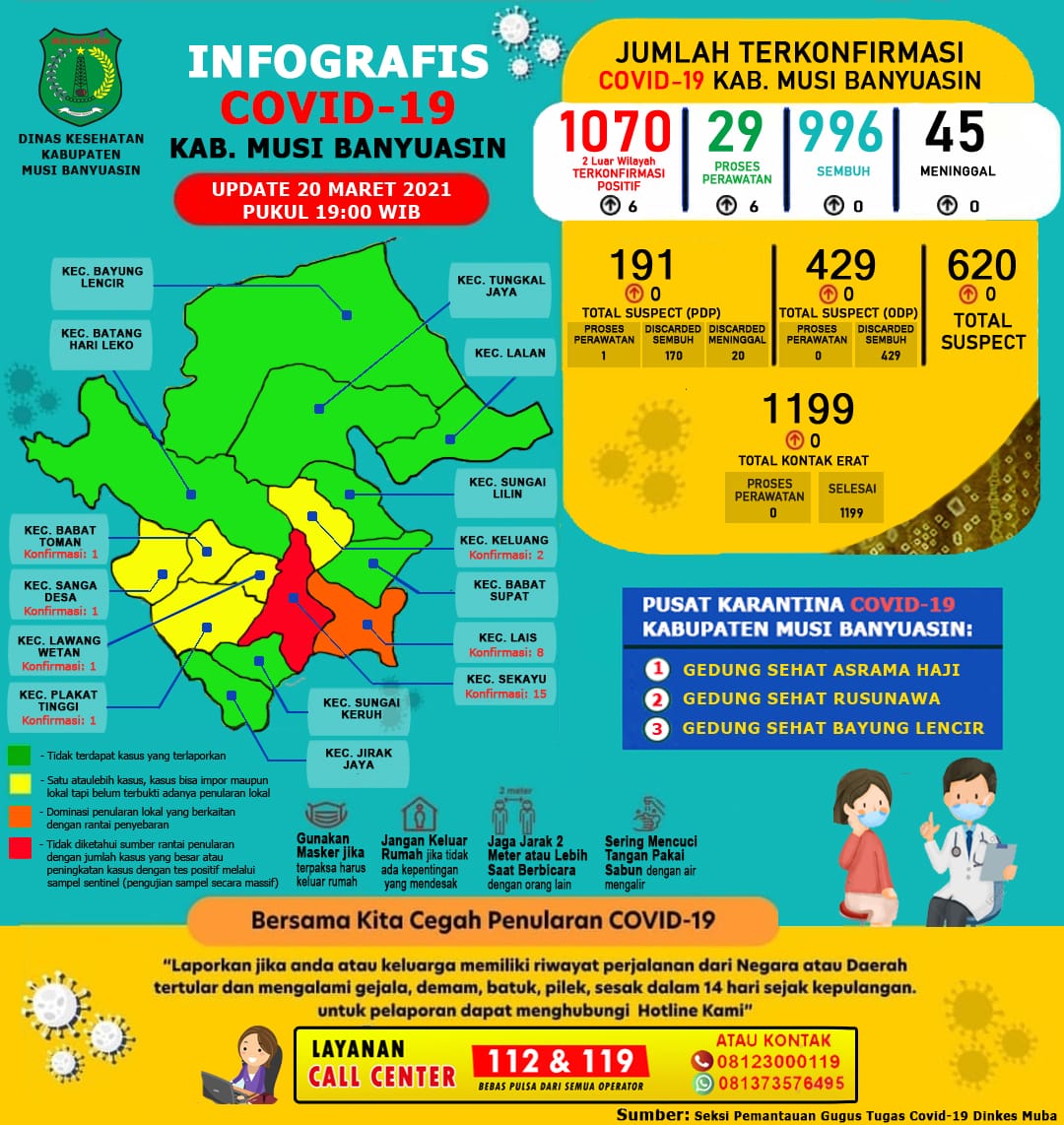 Sementara itu, berdasarkan data update Gugus Tugas Penanganan COVID-19 Muba 20 Maret 2021 tercatat ada sebanyak 429 ODP 429 selesai pemantauan 0 masih dipantau, 1.199 kontak erat 1.199 kontak selesai pemantauan 0 kontak erat yang masih dipantau, 191 PDP 1 proses pengawasan 190 selesai pengawasan
