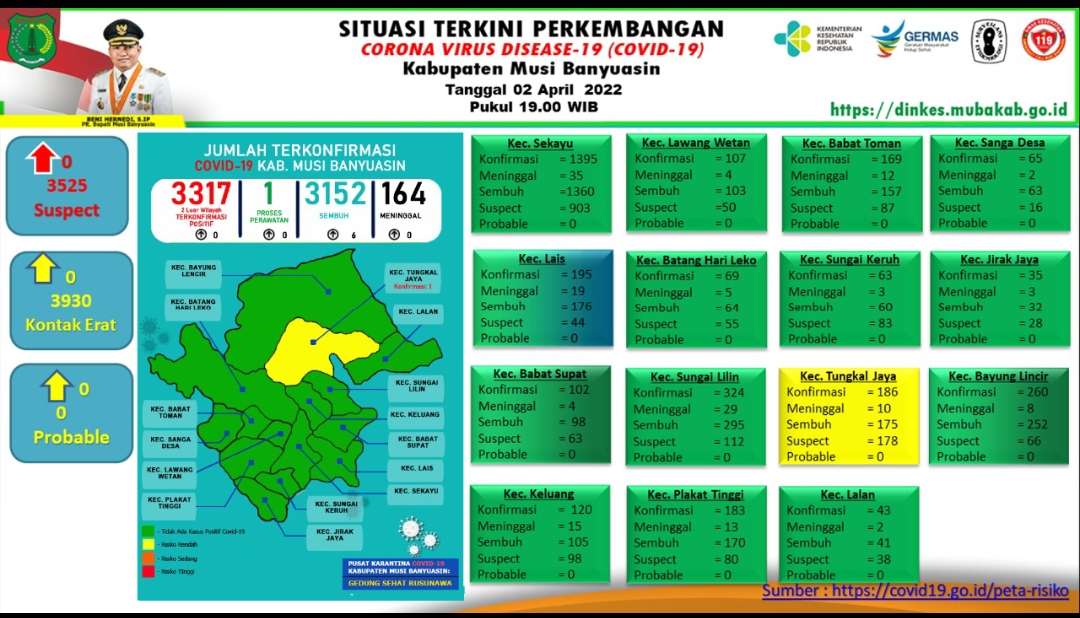 Kadin Kominfo Muba ini merinci, hingga 2 April 2022 ada sebanyak 3317 kasus. Diantaranya 3152 kasus sembuh. “Lalu, 1 kasus dirawat dan 164 kasus meninggal dunia,” urainya.