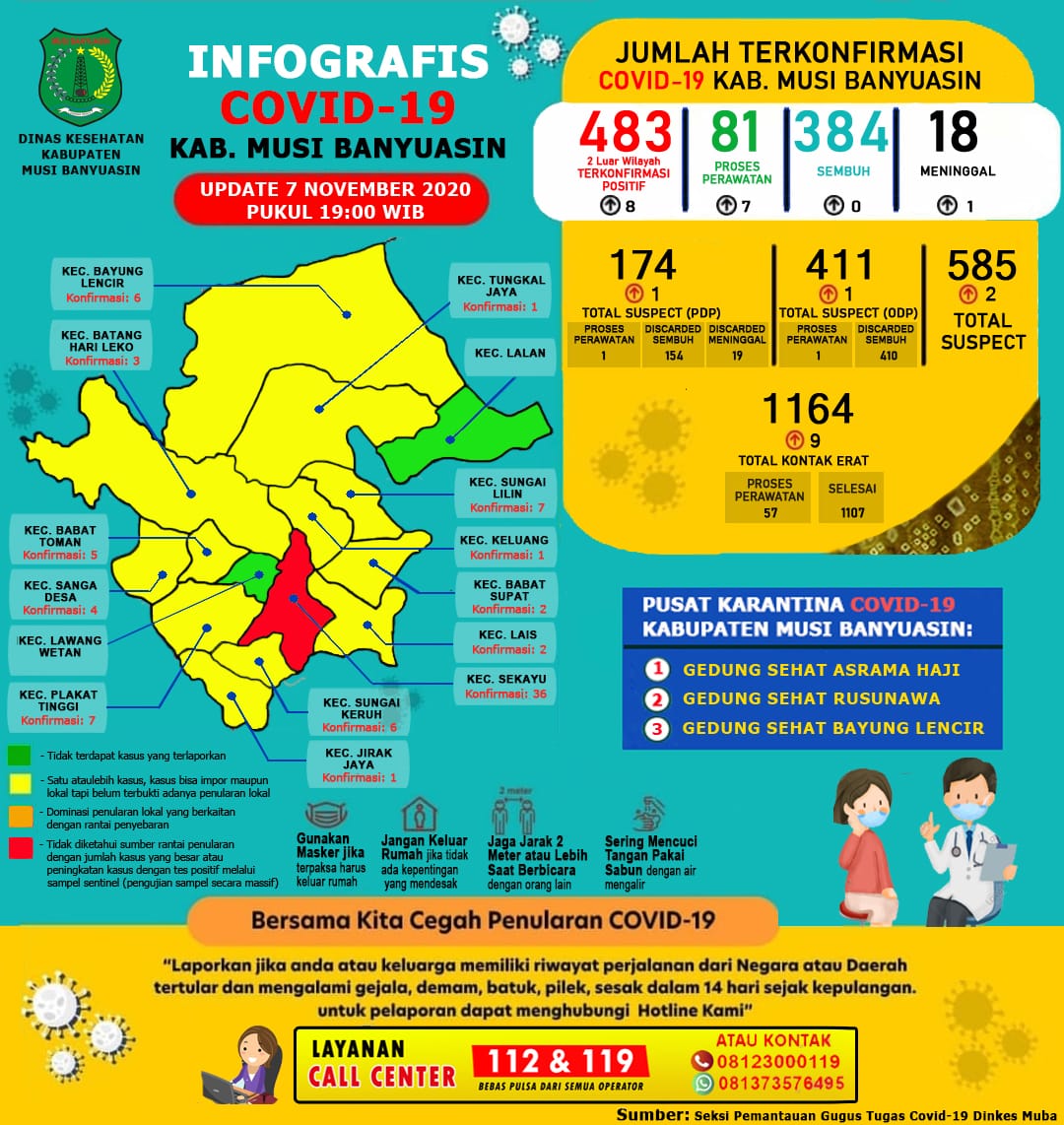 Sefti menambahkan, hingga 7 November 2020 ada sebanyak 483 kasus terkonfirmasi di Muba. “Diantaranya 384 kasus sembuh, 18 meninggal dunia, dan 81 masih dirawat,” terangnya.