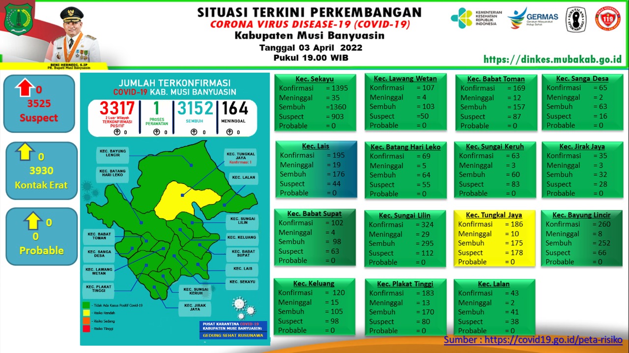 Kadin Kominfo Muba ini merinci, hingga 3 April 2022 ada sebanyak 3317 kasus. Diantaranya 3152 kasus sembuh, 1 kasus dirawat, dan 164 kasus meninggal dunia.