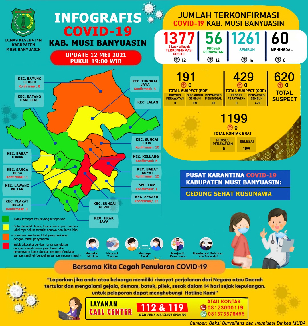 “Ada penambahan 16 kasus sembuh dan 12 terkonfirmasi positif per 12 Mei 2021,” ungkap Jubir Gugus Tugas Penanganan COVID-19 Muba, Seftiani Peratita SS MKes.
