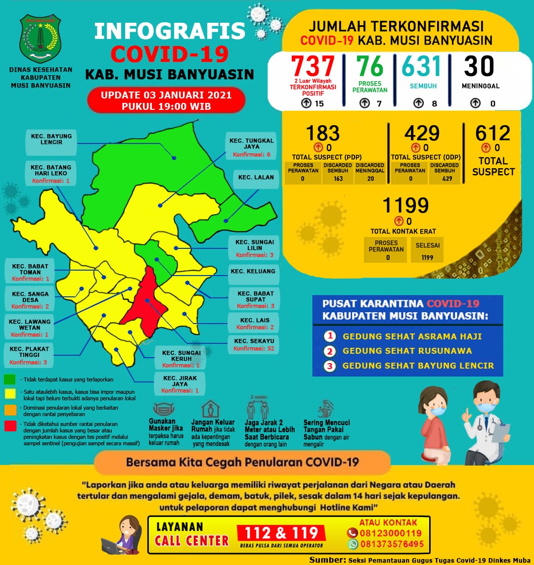 “Ada penambahan 8 kasus sembuh dan 15 terkonfirmasi positif COVID-19 per 3 Januari 2021,” ungkap Jubir Gugus Tugas Penanganan COVID-19 Muba, Seftiani Peratita SS MKes.